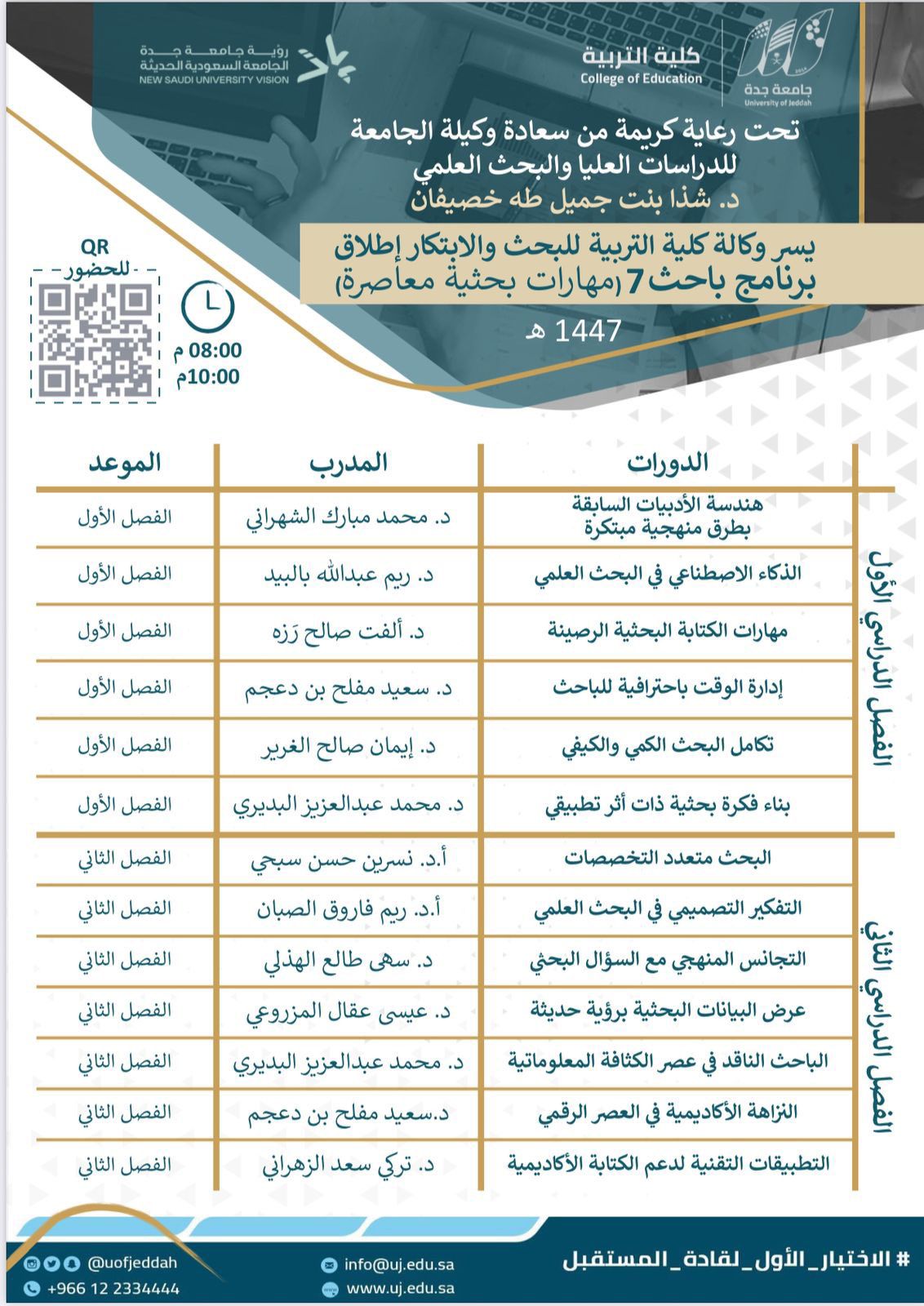 انطلاق برنامج باحث (7) والموجه للباحثين لتطوير المهارات البحثية وفق أسس علمية ومنهجية.